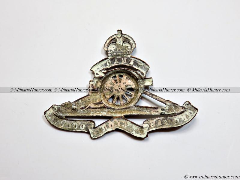 Cap badge de l'artillerie des Forces Expéditionnaires Canadiennes (CEF) durant la 1ère guerre, modèle avec la roue fixe. Attaches manquantes.