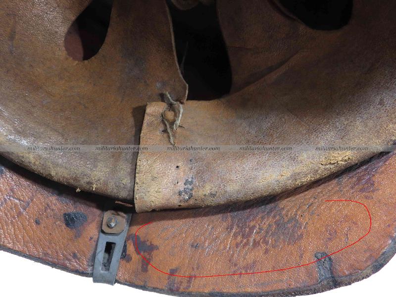Bombe en cuir bouillis noirci. Pas de double perçage mais renfort des oeillets en atelier de réparation, d'époque. Coiffe à dents de loup en cuir fauve avec son lacet.