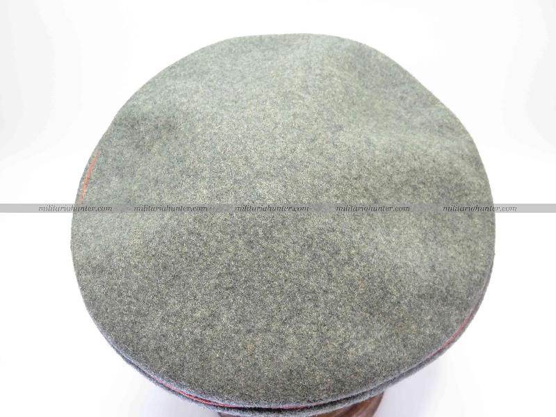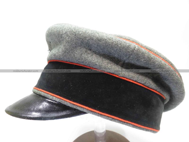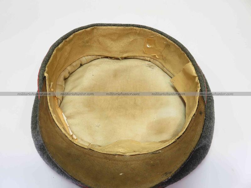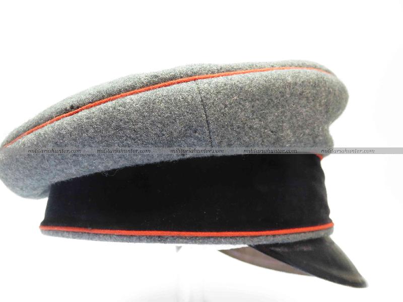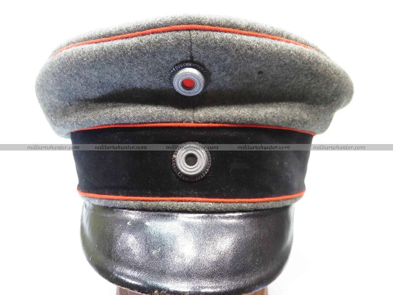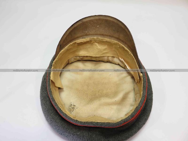 Casquette à visière en drap feldgrau, bandeau en velours noir passepoilé de rouge, cocardes d'officier prussien. Doublure luxe composée d'un tissu de soie blanche et d'un bandeau de sudation crème.