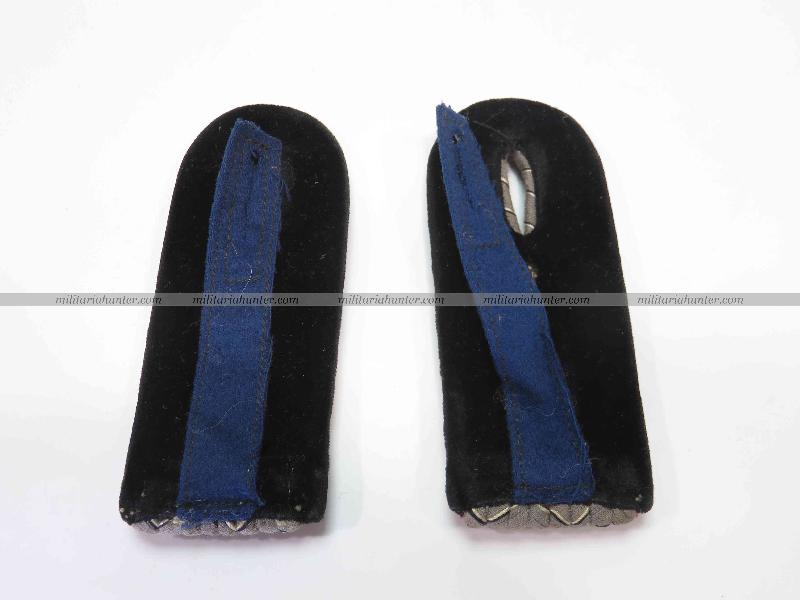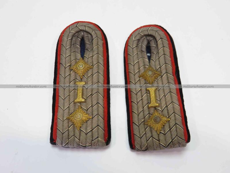 Les pattes d'épaules sont du modèle 1915 à tresses grises avec filets blanc et noirs aux couleurs de la prusse, passepoil rouge et dessous de velours noir. Sur chaque patte sont fixés 2 clous du grade et le chiffre romain I du corps d'armée. Contre pattes en tissu bleu.